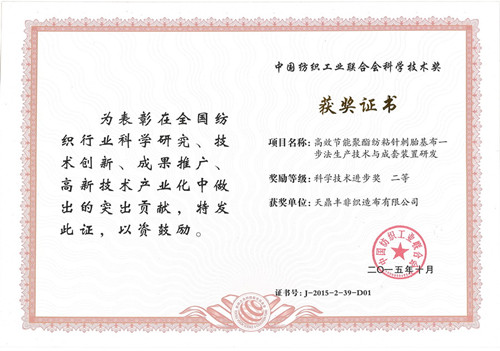 ¡¡¡¡11ÔÂ24ÈÕ£¬¡°·ÄÖ¯Ö®¹â¡±2015Äê¶ÈÖйú·ÄÖ¯¹¤ÒµÍŽá»á¿Æ¼¼½ÌÓý½±Àø´ó»áÔÚ±±¾©ÈËÃñ´óÀñÌÃÊ¢´ó¾ÙÐÐ ¡£»áÉÏÌ춦·á·ÇÖ¯Ôì²¼ÓÐÏÞ¹«Ë¾µÄ¡¶¸ßЧ½ÚÄܾÛõ¥·ÄÕ³Õë´ÌÌ¥»ù²¼Ò»²½·¨Éú²úÊÖÒÕÓë³ÉÌ××°ÖÃÑз¢¡·ÏîÄ¿ÈÙ»ñ¡°·ÄÖ¯Ö®¹â¡±2015ÄêÖйú·ÄÖ¯¹¤ÒµÍŽá»á¿Æ¼¼ÊÖÒÕǰ½ø½±¶þµÈ½± ¡£